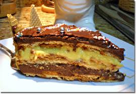 Mojamos las galletas en leche y un chorrito de brandy…si queremos…Y las vamos poniendo en el fondo de un molde desmoldable o aro, sobre ellas una capa de chocolate, una capa más de galletas, sobre éstas una capa de natillas, una de galletas, otra de chocolate…y así sucesivamente hasta acabar con una de chocolate. Yo he hecho tres capas.